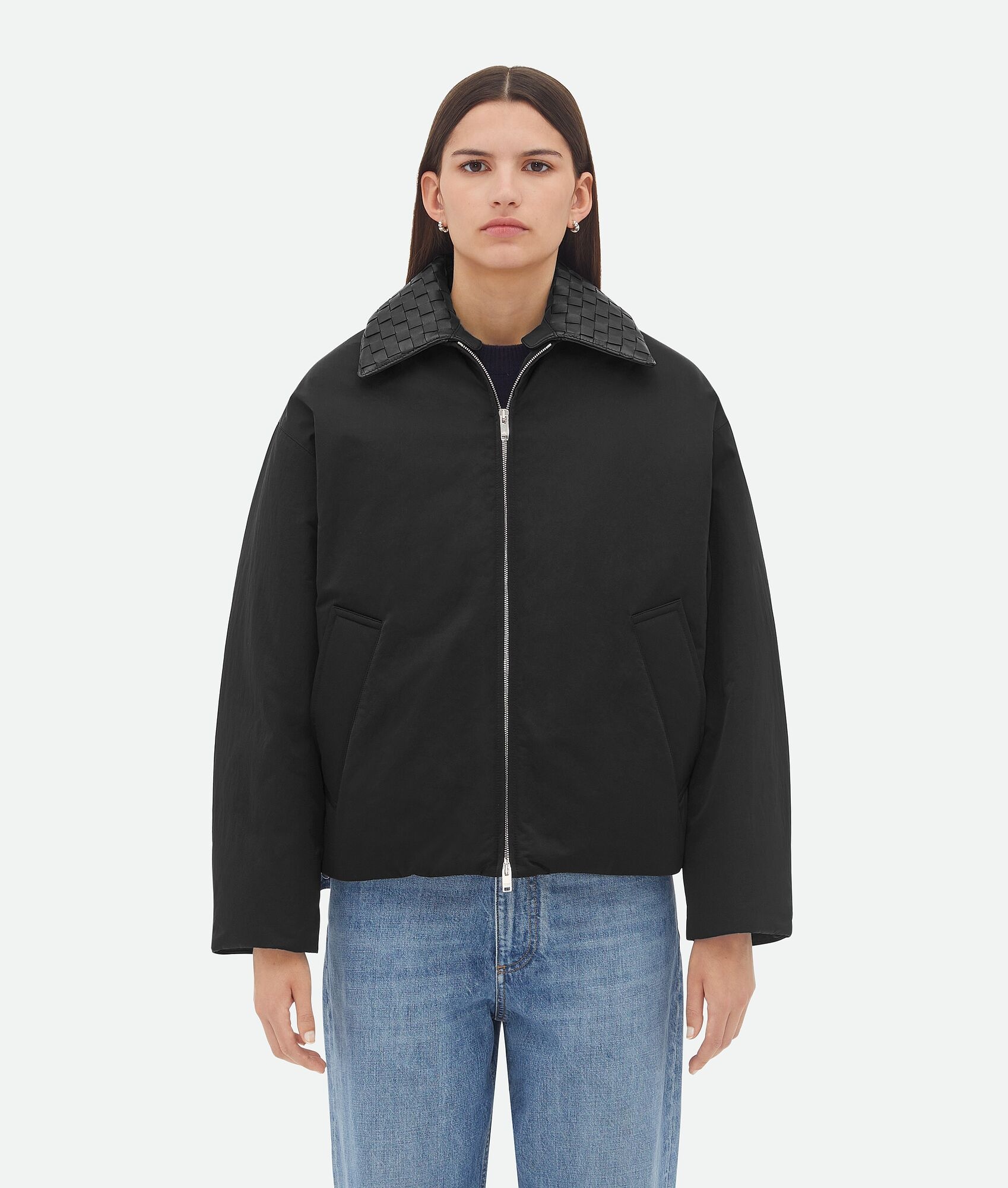 Puffer jacket in cotton twill with detachable Intrecciato leather collar. Product Details - Cotton twill puffer jacket - Detachable Intrecciato leather collar - Zip closure - Lined in cotton twill - Regular fit - Material: 100% polyamide - Color: Black - Made in: Italy - Product code: 809558VF4K01000 Size & Fit - Model is 177 cm | 5'9" and is wearing a Bottega Veneta size S