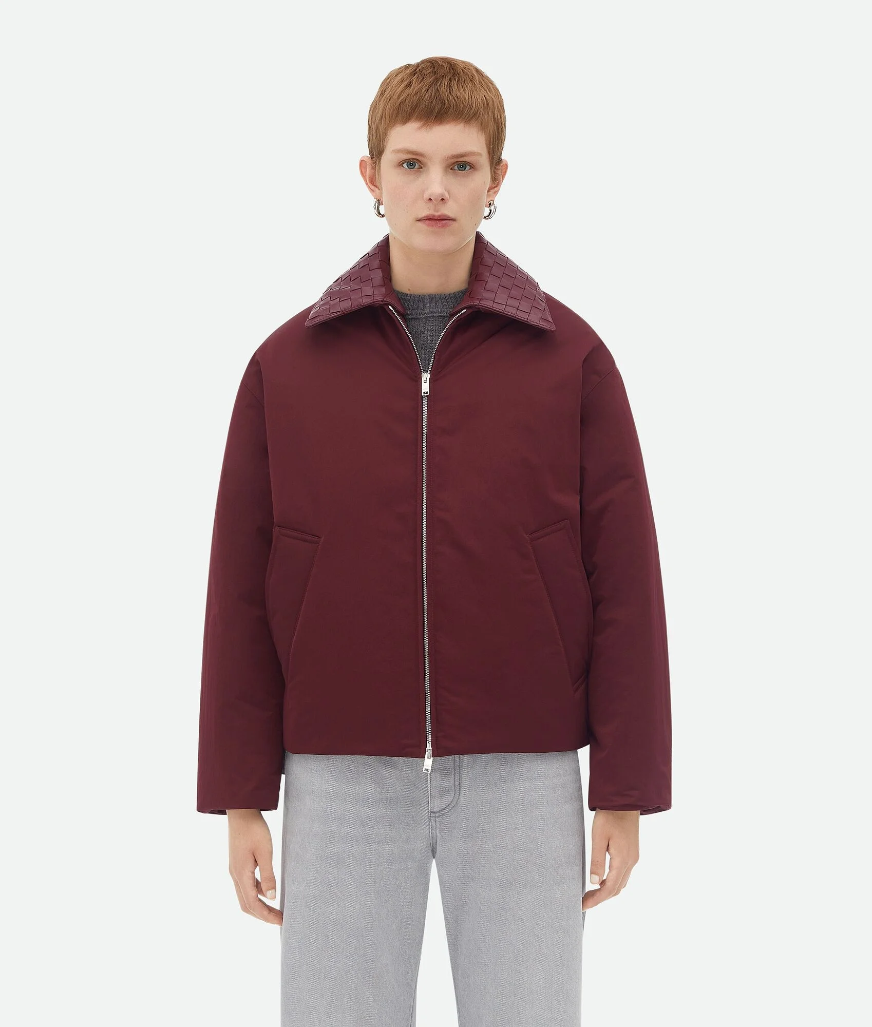 Puffer jacket in cotton twill with detachable Intrecciato leather collar. Product Details - Cotton twill puffer jacket - Detachable Intrecciato leather collar - Zip closure - Lined in cotton twill - Regular fit - Material: 100% polyamide - Color: Barolo - Made in: Italy - Product code: 809558VF4K02240 Size & Fit - Model is 180 cm | 5'11" and is wearing a Bottega Veneta size S