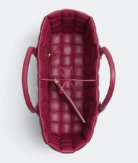 Large padded intreccio leather tote bag. Product Details - Large padded intreccio leather tote bag - Single detachable interior zipped pocket - Leather string closure - Material: lambskin - Lining: Lambskin bonded Intreccio - Color: Amaranto - Hardware: Gold finish - Height: 50 cm | 13.9" - Width: 52 cm | 13.3" - Depth: 18 cm | 6.2" - Handle Drop: 19 cm | 8.6" - Made in: Italy - Product code: 592122VMBK16215