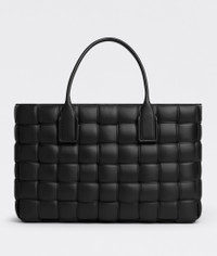 Large padded intreccio leather tote bag. Product Details - Large padded intreccio leather tote bag - Single detachable interior zipped pocket - Leather string closure - Material: lambskin - Lining: Lambskin bonded Intreccio - Color: Black - Hardware: Silver finish - Height: 50 cm | 13.9" - Width: 52 cm | 13.3" - Depth: 18 cm | 6.2" - Handle Drop: 19 cm | 8.6" - Made in: Italy - Product code: 592122VMBK18803