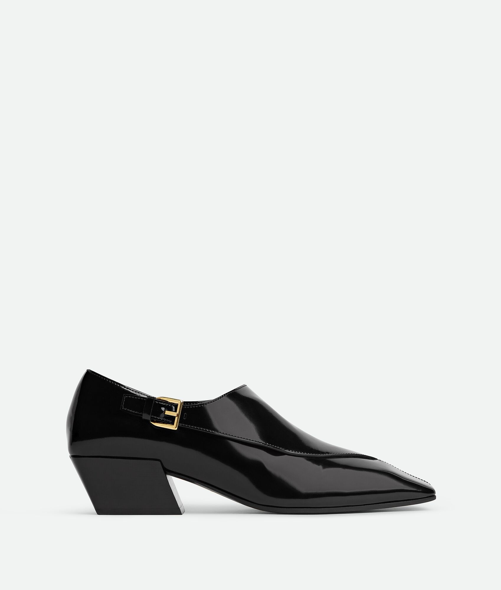 Monk strap shoe in brushed leather with squared toe and sculptural block heel. Product Details - Brushed leather monk strap shoe - Side buckle closure - Material: Calfskin - Lining: Calfskin - Color: Black - Hardware: Brass finish - Leather outsole - Heel: 4 cm | 1.6" - Made in: Italy - Product code: 827088V4BO01000