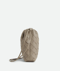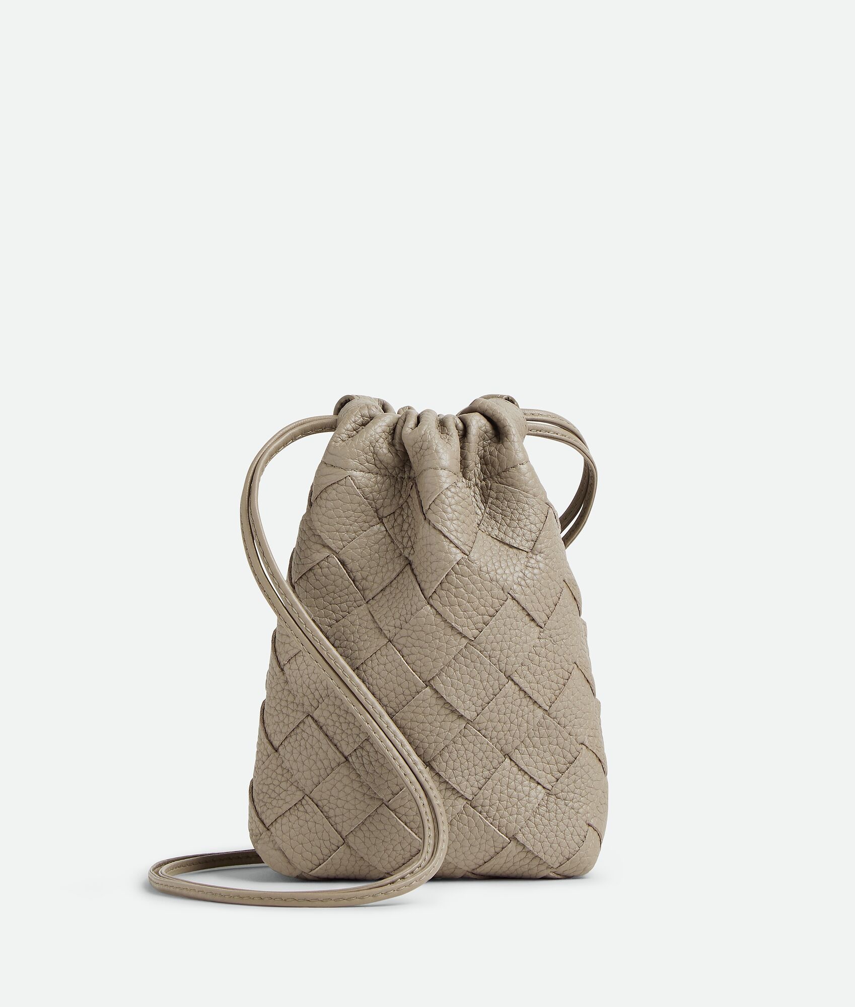 Dustbag in grained Intrecciato calf leather with drawstring closure and loop attachment Product Details - Grained Intrecciato calf leather dustbag with drawstring closure and loop attachment for cross-body carry - Single main compartment - Drawstring closure with leather loop attachment for cross-body carry - Material: Calfskin - Lining: Nylon - Color: Limestone - Height: 18.5 cm | 7.3" - Width: 12 cm | 4.7" - Depth: 4.5 cm | 1.8" - Strap Drop: 55 cm | 21.7" - Made in: Italy - Product code: 838786V5I532816