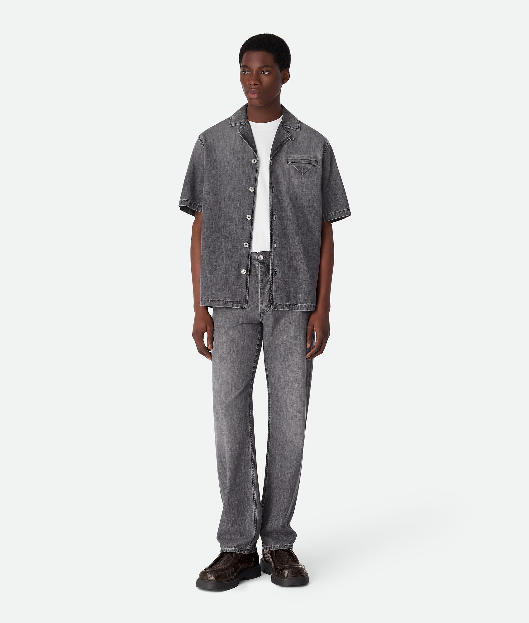 Product Details -Vintage black washed lightweight jeans - Intrecciato suede back patch - Straight leg - Button fly - Color: Washed Black - Made in: Italy - Product code: 813511V5SO01003 Size & Fit - Model is 188 cm|6'2" and is wearing a Bottega Veneta size 46