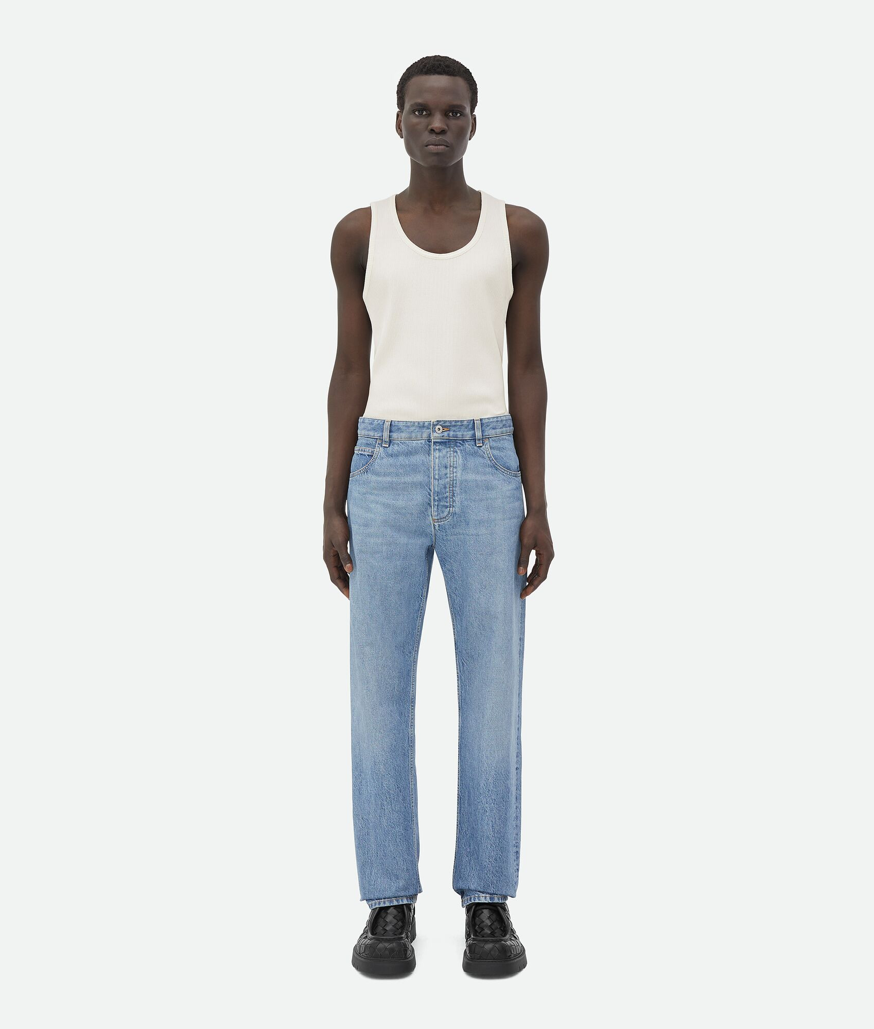 Denim trousers in a vintage indigo wash. Product Details - Vintage indigo denim trousers - Button closure - Straight leg - Material: 100% Cotton - Color: Mid Blue - Made in: Italy - Product code: 710238V42W04715 Size & Fit - Model is 189 cm|6'2" and is wearing a Bottega Veneta size 46
