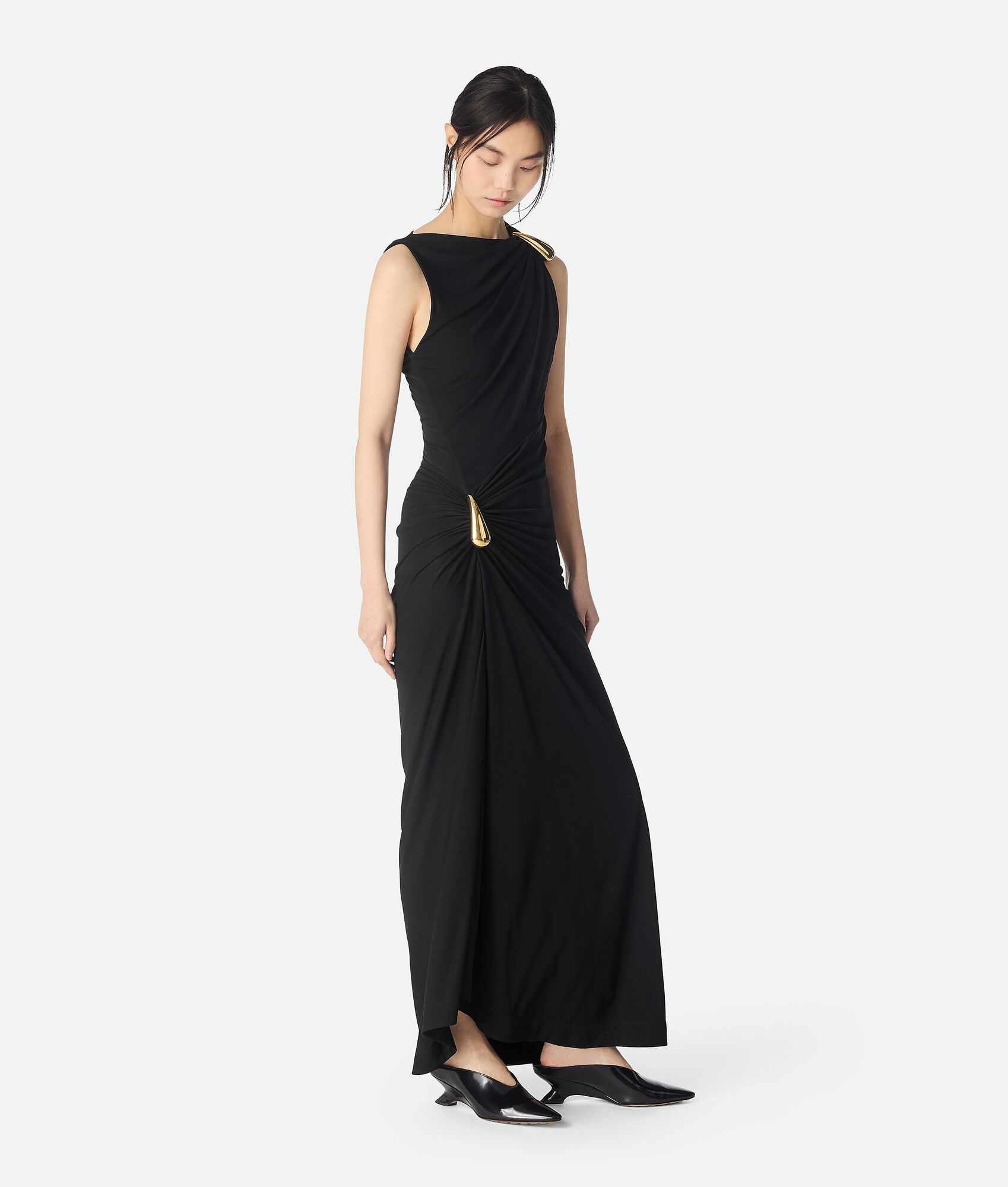 Dress in matte crepe viscose jersey with signature metal drop details. Product Details - Matte crepe viscose jersey dress - Metal drop details - Zipper closure - Slim fit - Material: 100% Viscose - Color: Black - Made in: Italy - Product code: 831590V4YX01000 Size & Fit - Model is 176 cm | 5'9" and is wearing a Bottega Veneta size 38