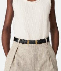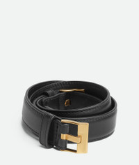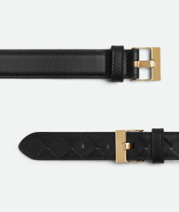 Belt in silky calf leather with double watch buckle and Intrecciato front detail. Product Details - Silky calf leather belt - Intrecciato leather front detail - Double metal buckle - Double prong closure - Lining: Calf leather - Color: Black - Hardware: Muse Brass finish - Height: 2.5 cm | 1" - Depth: 0.5 cm | 0.2" - Made in: Italy - Product code: 836927V4R451019