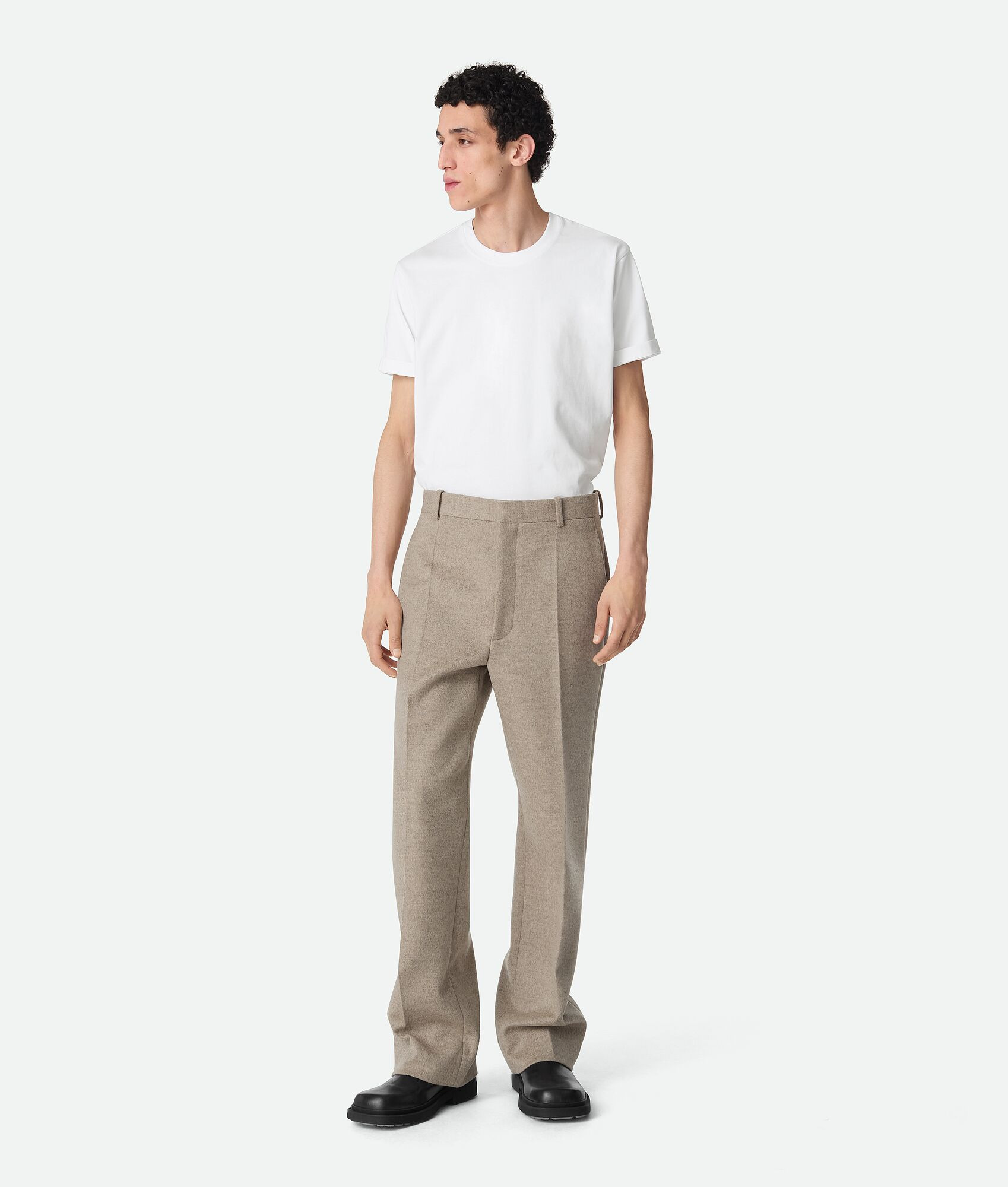 Trousers with straight leg in lightweight double wool and cashmere. Product Details - Lightweight double wool and cashmere pants - Straight leg - Zipper, hook and button closure - Color: Sandshell Melange - Made in: Italy - Product code: 811816V3OO02783 Material - Material: 80% wool, 20% cashmere Size & Fit - Model is 186 cm|6'1" and is wearing a Bottega Veneta size 46