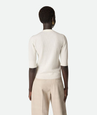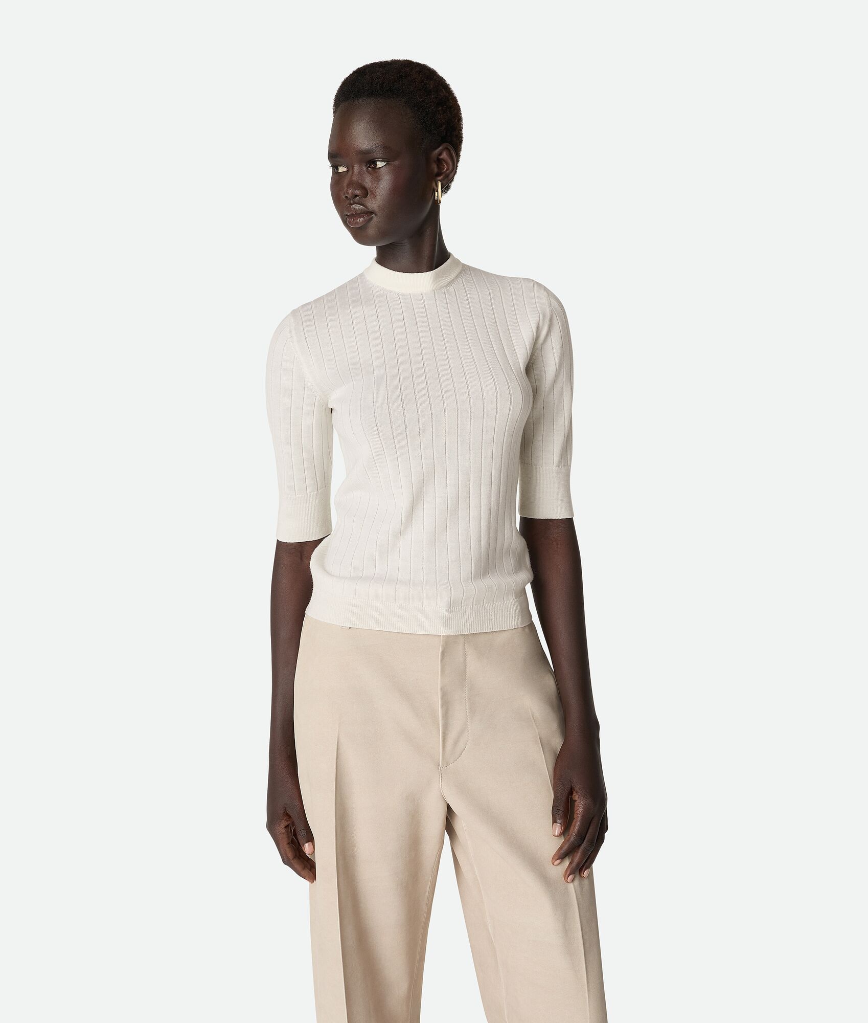Short sleeved top in lightweight wool rib. Product Details - Lightweight wool rib short-sleeved top - Regular fit - Color: Chalk - Made in: Italy - Product code: 835467V5L709071 Size & Fit - Model is 179 cm | 5'10" and is wearing a Bottega Veneta size S