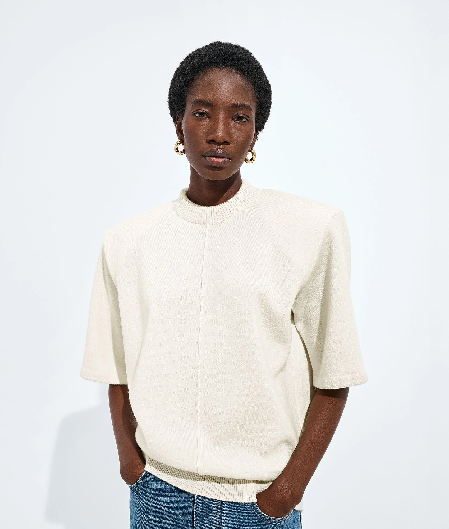 Product Details - Mid-weight wool tailored short sleeve top - Padded shoulders - Oversized fit - Color: Parchment - Made in: Italy - Product code: 862736V63S09107 Material - Material: 100% wool Size & Fit - Model is 178 cm | 5'10" and is wearing a Bottega Veneta size S