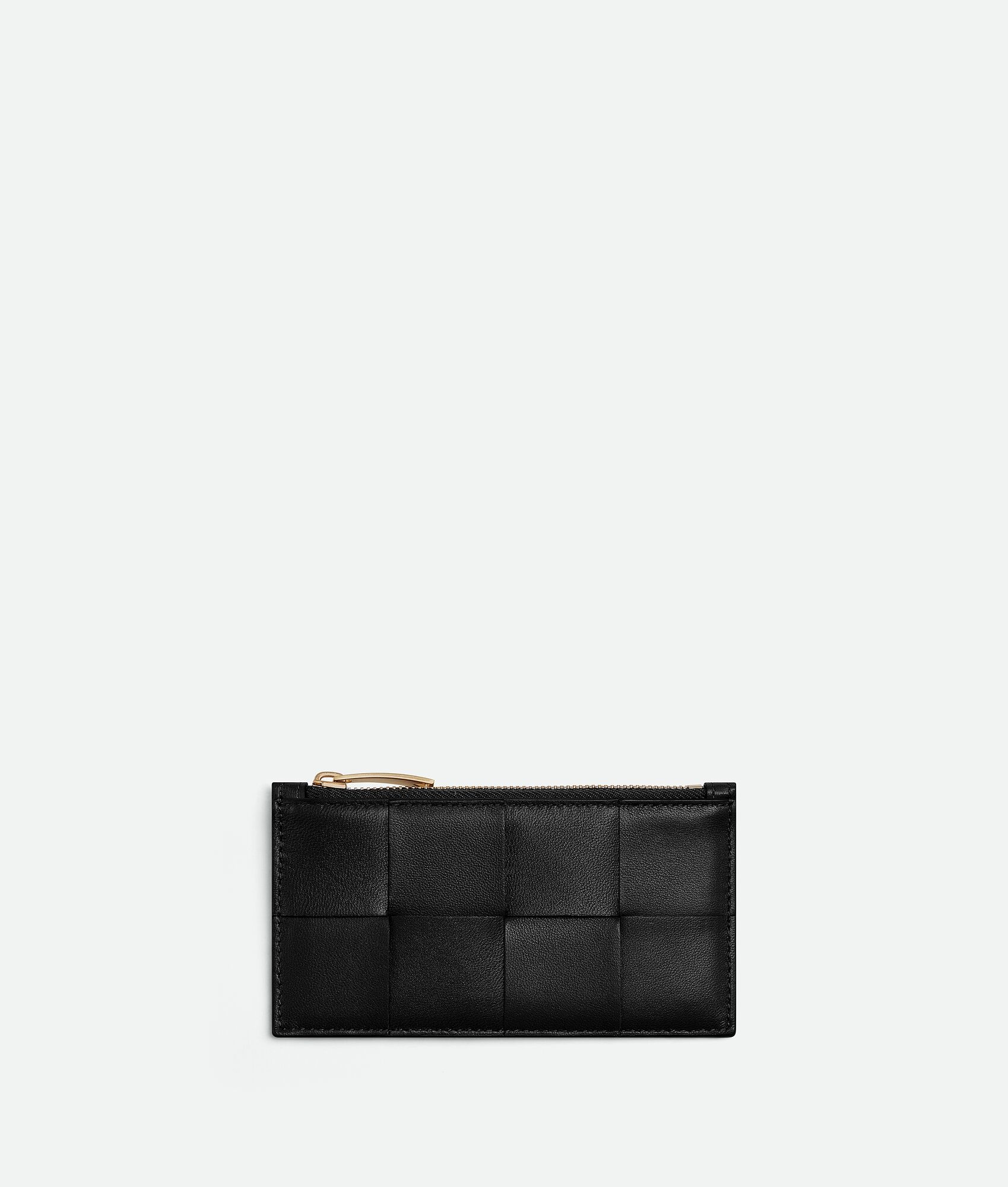 Intrecciato leather card holder. Product Details - Intrecciato leather card holder - Five card slots, one zipped coin purse - Material: Lambskin Calfskin - Lining: Calfskin - Color: Black - Hardware: Gold finish - Height: 7.5 cm - Width: 13.5 cm - Depth: 0.5 cm - Made in: Italy - Product code: 667129VCQC48425