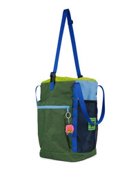 DETAILS Our nylon climbing utility bag with drawstring closure and zippered pockets. Features woven Brain Dead Equipment patch on the front, PVC logohead keychain zipper pull, and attached carabiner. Material: 100% Nylon Color: Forest Green / Blue