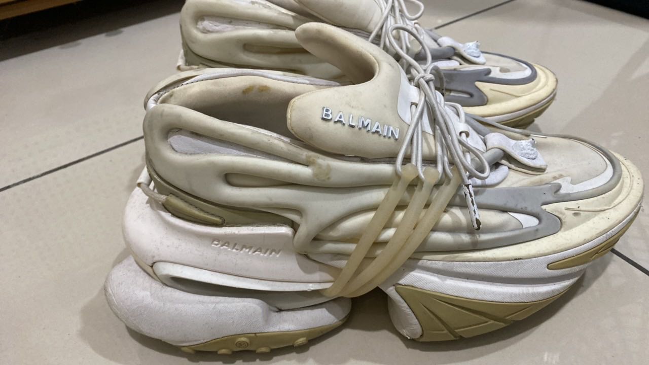 Bring a contemporary edge to your casualwear edit with Balmain's Unicorn sneakers. The white low-top design is set on platform soles with open sections and sharply pointed toes and finished with neoprene and leather trims. Upper: Fabric Lining: Leather Sole: Leather Insole, Rubber Sole Round Toe Lace Up (Used condition shoes) rating 8 to 10
