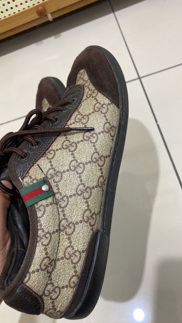Vintage Gucci brown and beige ‘GG’ monogram canvas leather low top sneakers. Please understand that since these items are vintage and/or recycled, they may in fact show a little sign of wear, aging, or slight discoloration.