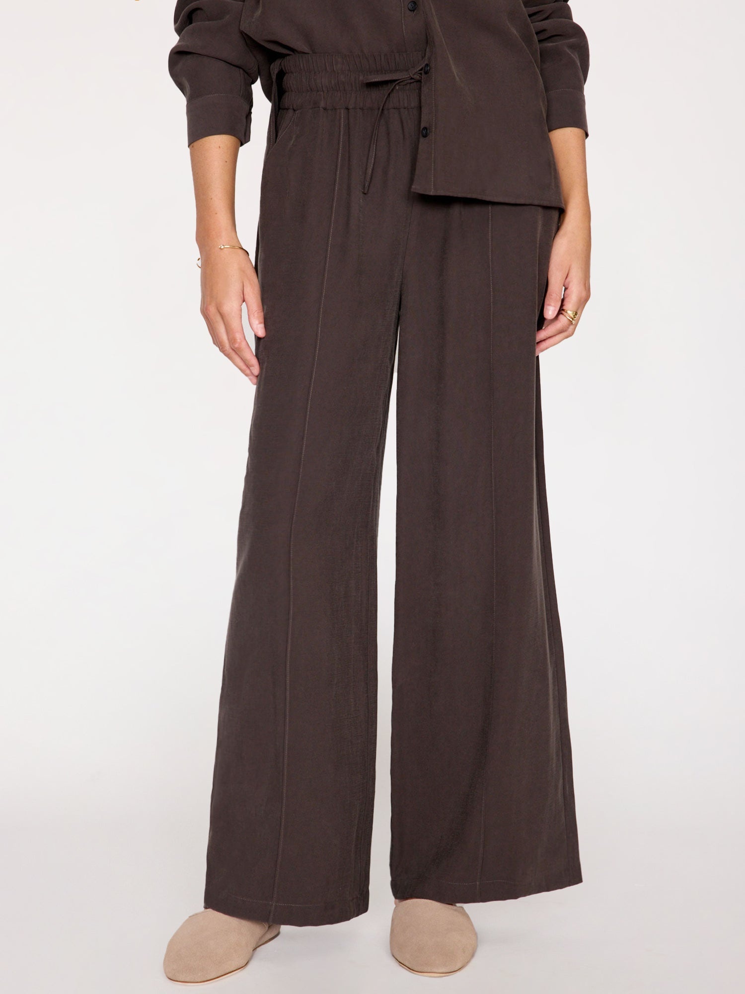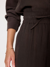 - Runs true to size - Pull-on style - Relaxed. wide-leg silhouette - Smocked, elasticized, drawstring waist - Two angled front pockets - Single back welt pocket - Pintuck detail at front legs - 29” - 93% Rayon/7% Polyester - Imported - Model is 5'9" and is wearing a size Small Our fluid Aaron Pant will help you make a major luxe lounge statement. In a beautiful, drapey fabric, its relaxed, wide legs and drawstring-smocked elastic waist not only accentuate the feminine silhouette but also add a bit of movement that lets you flow through your day. We love it with all our knitwear or with our matching Amara Blouse for the ultimate set.
