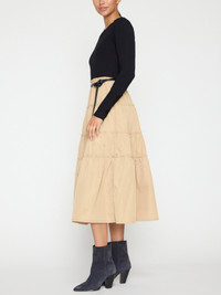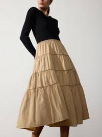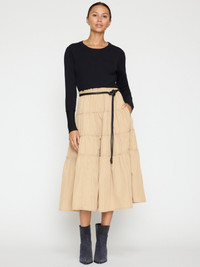 - Runs true to size - Relaxed fit - Midi length - Knit body - Woven tiered skirt with paper bag finish at each seam - Crew neckline with rib trim - Wrist length sleeves - Self-encased elasticized waistline - On seam pockets - Length 47” - Body 65% Viscose/35% Nylon Knit, Skirt 100% Polyester - Imported - Model is 5'9" and is wearing a size Small A special addition to our sought-after dress collection, our Ava Tiered Dress is mixed-media perfection. With a fully fashioned knit body and a slight nylon-feel woven tiered skirt it is pure modern elegance. This crewneck dress has special details like a paper bag finish at each seam and a self-encased elasticized waistline for added shape and comfort. Always feminine, Eva features wrist length sleeves that are pleated into the shoulders for a slight puff sleeve. Designed to take you day to night, occasion to occasion…pure luxury to live in.