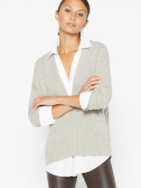 - Runs true to size - Designed for a relaxed fit so take your normal size - Hip length with curved hem underlayer - Pre-styled V neck with a georgette shirt collar - Fixed button placket at one button - Signature rib saddle shoulder - Fine ribbing on cuffs, hem, placket and pockets - 70% Wool/30% Cashmere with Recycled Poly partial underlayer - Imported - Dry clean recommended - Model is 5'9" and is wearing a size Small. An exciting new addition to our Looker Cardigan Collection, our Callie Layered Looker Cardigan is the epitome of effortless chic. In a popover silhouette, it is pre-styled with a partial georgette underlayer visible at the neckline, cuffs and hem. This sophisticated faux-cardigan has a fixed placket at one button which creates that true 2-in-1 style appeal. In a relaxed fit, with our signature rib saddle shoulder detail, this Looker is the elevated everyday staple you can’t live without. We love it tucked in or out for an instant outfit transformation. Part of our Kinder To The Environment Collection, Callie includes a recycled georgette underlayer to reduce its carbon footprint.