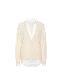 - Runs true to size - Designed for a relaxed fit so take your normal size - Hip length with curved hem underlayer - Pre-styled V neck with a georgette shirt collar - Fixed button placket at one button - Signature rib saddle shoulder - Fine ribbing on cuffs, hem, placket and pockets - 70% Wool/30% Cashmere with Recycled Poly partial underlayer - Imported - Dry clean recommended - Model is 5'9" and is wearing a size Small. An exciting new addition to our Looker Cardigan Collection, our Callie Layered Looker Cardigan is the epitome of effortless chic. In a popover silhouette, it is pre-styled with a partial georgette underlayer visible at the neckline, cuffs and hem. This sophisticated faux-cardigan has a fixed placket at one button which creates that true 2-in-1 style appeal. In a relaxed fit, with our signature rib saddle shoulder detail, this Looker is the elevated everyday staple you can’t live without. We love it tucked in or out for an instant outfit transformation. Part of our Kinder To The Environment Collection, Callie includes a recycled georgette underlayer to reduce its carbon footprint.