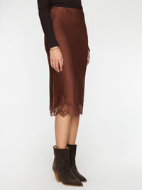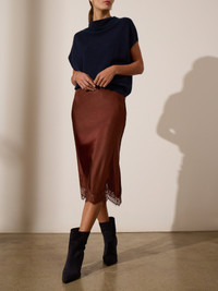 - Runs true to size - Elasticized waistband - Invisible side seam zip - Length 29.5” - 92% Silk, 8% Spandex with Lace - Imported Embrace a season of romance in a lush silk skirt featuring a custom-to-us colorway with inset tonal lace at the hemline. Designed to drape gently, this skirt is a must-have staple for the fashion set. Finished with an internal elasticized waistband and invisible side zipper with a hook-and-eye closure for an easy fit. Exclusive to BrochuWalker.com and our Brochu Walker Atlanta, Carmel-by-the-Sea, Southampton & Westport Stores.