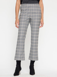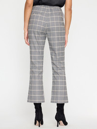 - Runs true to size - Tailored fit - Mid rise - Cropped length with a kick flare - Side zipper with hook & eye - Elasticized waistband - Side seam pockets - Back welt pockets - 27” inseam - Glen plaid - 69% Polyester/29% Viscose/2% Spandex - Imported In a light stretch, suiting plaid, our Elias Pant has a feminine, body-skimming silhouette. In a cropped length that culminates in a chic kick-flare, that is pure tailored femininity. We love it with boots for an everyday vibe or dressed up with pumps for an evening out. Finishing touches like a comfortable elasticized waistband and functional pockets add the Brochu Walker versatility you love.
