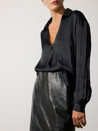 - Runs true to size - Relaxed fit - Hits mid hip - Popover silhouette in drapey crinkled satin - Collared, V neckline - Dropped shoulders - Long sleeves with button cuffs - Back yoke with inverted box peat at the center back - Slight shirttail hemline with inset gussets at the side seams - 100% Polyester - Imported - Model is 5'9" and is wearing a size Small In a modernized popover silhouette, that features a collared V neckline dropped shoulders, and a slight shirttail hem accented by inset gussets at the side seams, our Hailee Blouse is everything feminine. This relaxed fit, popover crinkled satin blouse gently drapes as it grazes your body, while the deep V neckline makes it perfect for all your special occasions.