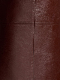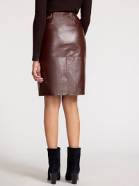 - Tailored fit - Above-the-knee length - Elasticized waistband with side zip - Center back slit - 62% Polyester, 38% Polyurethane - Imported - Model is 5'9" and is wearing a size Small Crafted in glossy vegan leather, the Inez Skirt is sleek and sophisticated. With a clean hem, subtle stitching, and a sensual slit, it pairs effortlessly with cozy knits or statement blouses.