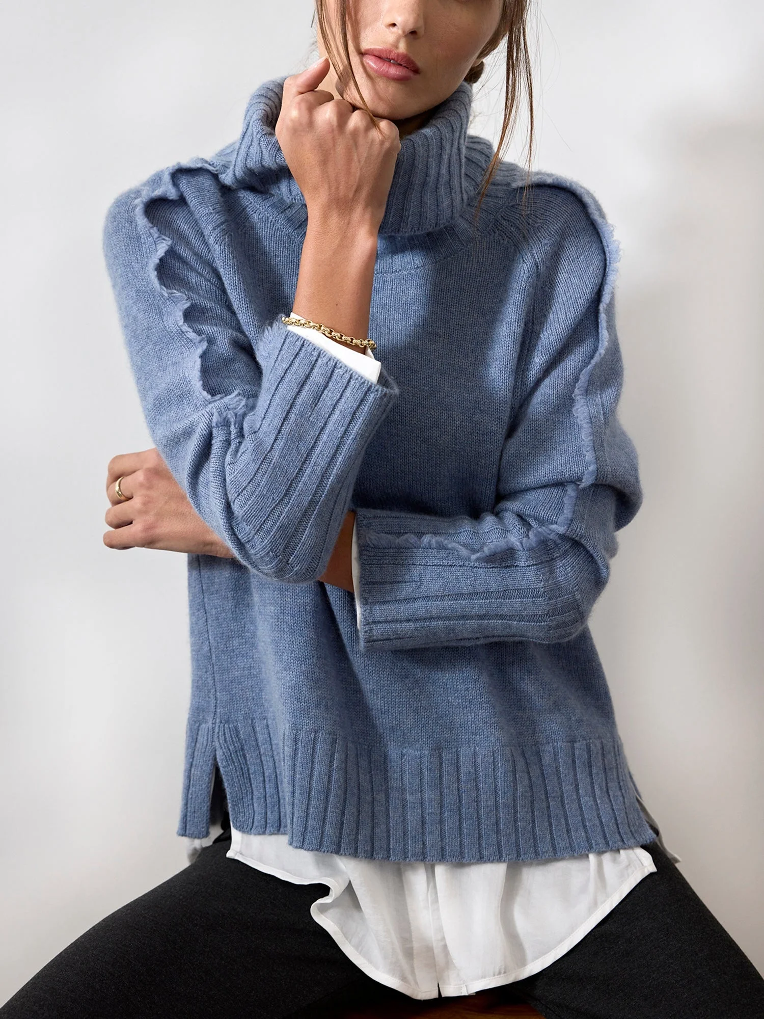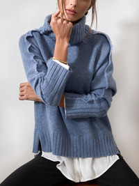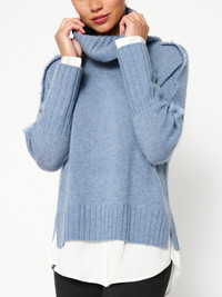 - Runs true to size - Fold over turtleneck - Self-fringe trim along the sleeves - Raglan long sleeves - Ribbed trim neck, cuffs and hem - Curved hem, hammered satin partial underlayer - 70% Wool/30% Cashmere - Dry clean recommended - Imported - Model is 5'9" and is wearing a size Small We combined two of our best-selling styles into one special sweater that is sure to become an instant signature piece. Our most-loved Jolie Turtleneck is now in an effortless Looker silhouette. Self-fringe trim details add dimension to the long raglan sleeves, a fold over turtleneck which can also be worn scrunched down and curved hem, hammered satin partial underlayer, visible at the hem and cuffs, keep you looking cozy chic. With split sides for added ease and wide ribbing on the cuffs and hem, this relaxed, slightly oversized sweater will be the one Looker you turn to as the seasons change.