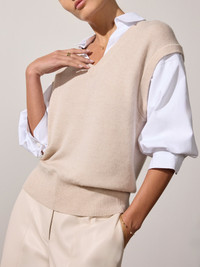 - Runs true to size - Relaxed fit - V neck vest overlayer with pre-layered shirt underlayer - Elbow length sleeves with a blouson (pushed-up) effect - Button cuffs - Signature center back seam detail - Ribbed neckline, armholes trims and hem - 70% Wool/30% Cashmere Overlayer/Cotton Blend Underlayer - Imported - Model is 5'9" and is wearing a size Small Our Kate Shirt Looker Sweater combines everything you love about our pre-layered knitwear and our feminine shirts. With a pre-styled v neck vest overlayer and a dramatic, elbow-length, blouson sleeve it is wear-now, wear-forever perfection. Relaxed, sensual, effortless, it is the style that makes an everyday statement. Shop The Kate Collection
