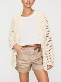 - Relaxed fit - Long sleeves - No closure - Signature outside link seam at center back body - Hits at low hip - 100% organic mercerized cotton - Imported - Model is 5'9" and is wearing a size Small A new Brochu Walker silhouette, our Keifer Cardigan features an open engineered, crochet-inspired stitch. A chic, layering piece, this organic, mercerized cotton has a timeless quality for the new season. We love it belted or worn open; it also serves as a chic beach cover up. Part of our ‘Kinder To The Environment’ collection, it uses 100% Organic Cotton Yarn eliminating hazardous pesticides other toxic chemicals from the surrounding area and adhere to more rigorous safety and testing standards.