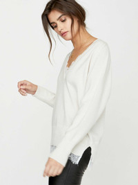 - Runs true to size - Designed for a relaxed fit so take your normal size - V neck - Raglan long sleeves with seam detail - Lace and ribbed trim neckline and hem - Side split hem - 70% Wool/30% Cashmere with 100% Chantilly Lace - Imported - Dry clean recommended - Model is 5'10" and is wearing a size Small Subtle, yet romantic lace detailing at the V neckline and bottom hem adds feminine allure to our Looker Layered Lace V-neck. This elegant long sleeve sweater features a side split hem for ease of wear and a comfortable fit. The lace elevates this sweater from an everyday staple to a piece that can be worn on any occasion throughout the coming months. Lightweight, yet cozy, the wool and cashmere blend make it as cozy as it is sophisticated. Shop V-Neck Sweaters