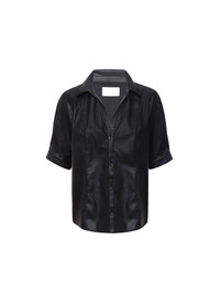 - Runs true to size - Tailored fit - Collar - Button front placket - Princess seams - Button closed cuffs - 87% Polyester, 13% Polyurethane - Imported - Model is 5'9" and is wearing a size Small A sleek button-up crafted in vegan leather, the Max Shirt offers a sophisticated, feminine fit. Princess seams and functioning cuffs elevate this timeless style.