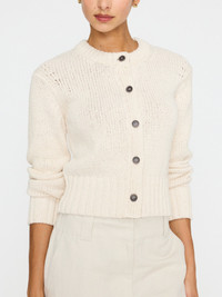 - Shrunken fit - Hits at the top of the hip - Crewneck - Button front with tonal grosgrain detailing at inside placket - Long sleeves - Ribbed neckline, cuffs and hem - Exposed center back seam - Italian yarn - 55% Organic Cotton/45% Recycled Cotton - Imported In a new Brochu Walker silhouette, our Mills Crewneck Cardigan has a button front placket and a modern shrunken fit that makes it effortless yet polished. In an Italian, organic cotton yarn it has a subtle two-toned effect that adds dimension and surface interest. Special details like tonal grosgrain detailing at the inside placket and our signature center back seam make Mills the cardigan sweater that will transition you from one season to the next. Designed to be worn alone or layered. Part of our Kinder to The Environment Collection. This style is made from both organic and recycled cotton.