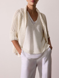- Runs true to size - Layered V neckline - Sleeveless - Fixed self-roll back sleeve detail with self-tab - Pre-styled underlayer trim - Curved hem underlayer - Straight ribbed hem overlayer - 100% Hemp w/ 100% linen partial underlayer - Imported Our Morrow Layered Looker Sweater takes a classic silhouette and elevates it with a pre-styled, underlayer and a fixed, self-roll back sleeve detail with self-tab. The subtle, linen underlayer detail peeks out at the neckline and hem, making this sleeveless, V neck knit a feminine essential for everyday subtle sophistication and the ultimate two-in-one style.