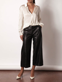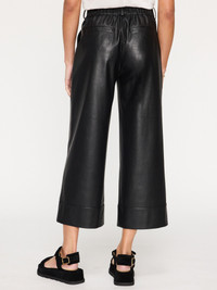 - Runs true to size - Tailored fit through the waistline - Wide leg - Cropped - 25" inseam - Fly front with elasticized back waistband - Stitch detail on the front of the legs - Deep stitch detail at the pant cuffs - Two front slant pockets - Two back welt pockets - Vegan leather - 87% Polyester/13% Polyurethane - Imported The newest addition to our sought-after vegan leather collection, our Odele Cropped Pant is as cool as it is chic. Tailored through the waistline, with wide legs that culminate in deep-stitch-detail cuffs, these vegan leather pants add a definitive modern touch. An elasticized-back, pull-on waistband adds comfort, while front slant pockets and back welt pockets add function…sophisticated ease that you can’t live without.