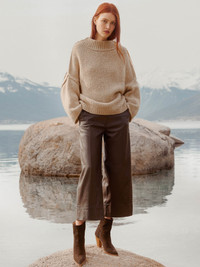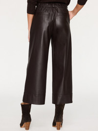 - Runs true to size - Tailored fit through the waistline - Wide leg - Cropped - 25" inseam - Fly front with elasticized back waistband - Stitch detail on the front of the legs - Deep stitch detail at the pant cuffs - Two front slant pockets - Two back welt pockets - Vegan leather - 87% Polyester/13% Polyurethane - Imported The newest addition to our sought-after vegan leather collection, our Odele Cropped Pant is as cool as it is chic. Tailored through the waistline, with wide legs that culminate in deep-stitch-detail cuffs, these vegan leather pants add a definitive modern touch. An elasticized-back, pull-on waistband adds comfort, while front slant pockets and back welt pockets add function…sophisticated east that you can’t live without.