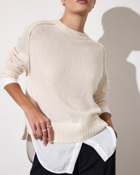 - Runs true to size - Oversized, relaxed fit - Crewneck - Saddle shoulders - Curved high low hem - 70% Wool/30% Cashmere with a partial recycled georgette underlayer - Imported We took our forever best-selling signature V Neck Looker and turned it into an everyday crewneck. Knit with our finest wool and cashmere blend yarn, this sweater is paired with a recycled georgette partial shirting underlayer giving the illusion of two pieces in one. Lightweight and always cozy, our Parson Crew Looker is the new Brochu Walker classic. Part of our ‘Kinder To The Environment’ collection, the underlayer is made from recycled fiber to reduce its carbon footprint.