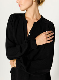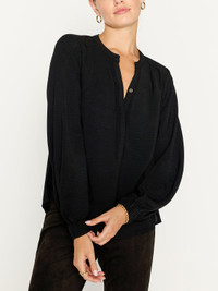 - Runs true to size - Slightly relaxed shape for an easy fit - Popover silhouette - Hidden-button placket with contrast georgette, raw-edged trim - Pleated shoulders - Full sleeves - Elasticized cuffs - Straight hem - Length 25” based on a size small - 100% Creped Poly - Italian Fabric - Imported New popover silhouette with Brochu Walker signature details. Designed to be slightly oversized and flowy, our Phoebe Blouse is the epitome of feminine modernity. It features a sensual, pleated shoulder detail, hidden-button placket with contrast georgette, raw-edged trim, and billowy, elastic cuffed sleeves for added boho-chic. In a new Italian creped fabric, it is effortless perfection.