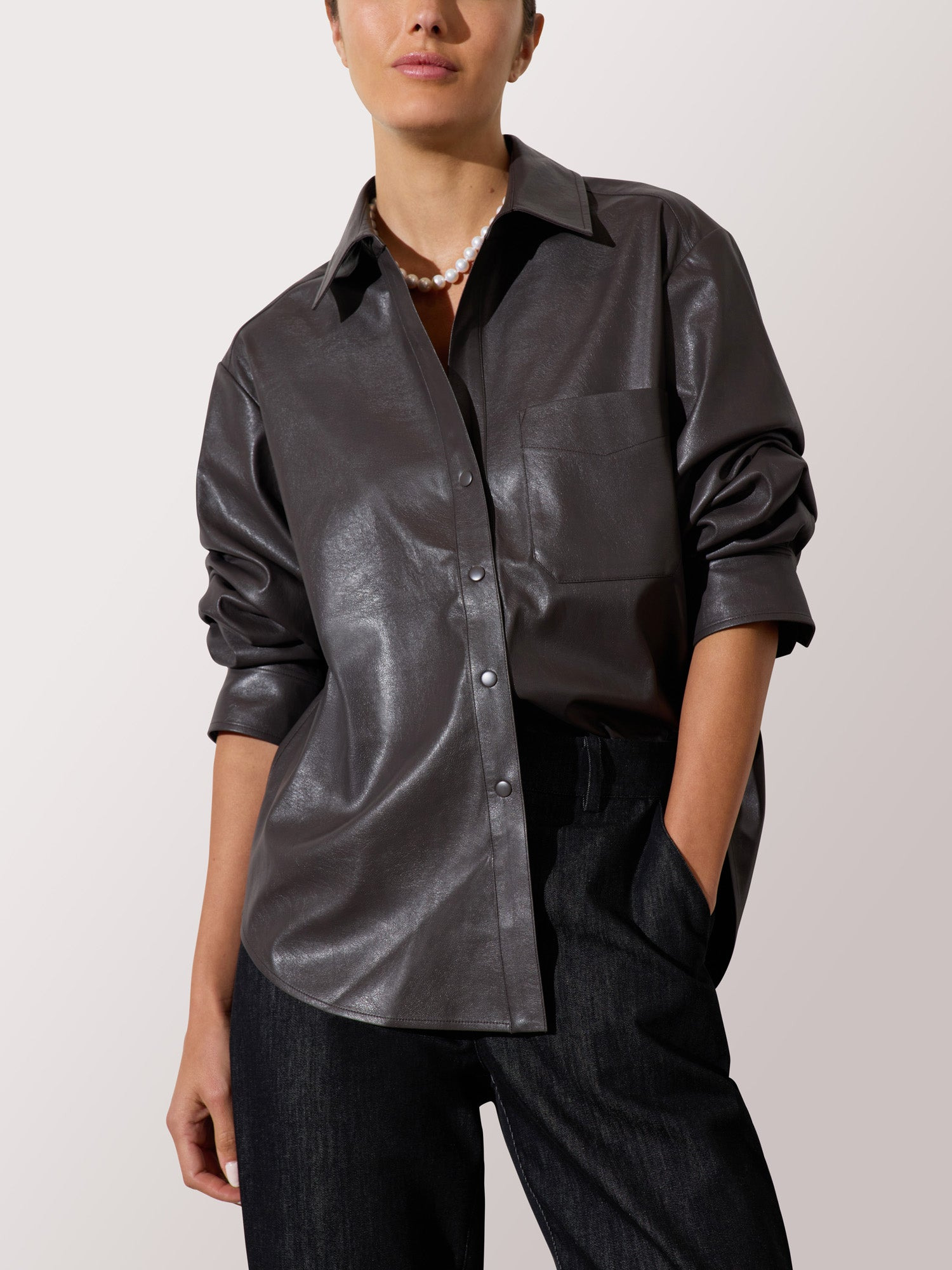 - Runs true to size - Slightly relaxed shape for an easy fit - Button front placket - Pre-styled scrunched sleeves - Locker loop at the back neck/yoke - 87% Polyester, 13% Polyurethane - Length 27 ½” on Size Small - Imported - Model is 5'9" and is wearing a size Small The newest addition to our essential Shirt Collection, our Pia Shirt features a pre-styled scrunched sleeve, now in vegan leather.