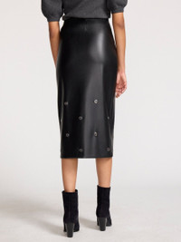 - Midi length - Pencil silhouette with center front slit - Silver metal grommet detail - Elasticized waistband with side zipper - Fully lined - 50% Polyester / 50% Polyurethane - Imported - Model is 5'9" and is wearing a size Small A minimalist silhouette with maximum impact, Rai is a vegan leather pencil skirt with grommet detailing and a sensual front slit. Made from soft Italian fabric, it’s evening-ready yet all-day wearable.