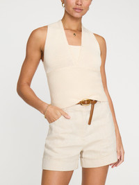- Runs true to size - Slim fitting to body - Halter neckline with self-neck insert for layered effect - Sleeveless - Deep horizontal ribbed hem at the front - Deep rib at back body hem - Side seams overlap front to back body - 100% Mercerized Cotton - Imported - Model is 5'9" and is wearing a size Small Sensuality is at our core and our Ramona Halter Top is the essence of all things feminine. In a beautiful halter neck silhouette that that gently crosses over at the neckline, it features a self-neck insert that creates the illusion of a halter being worn over a bandeau. Special details like deep ribbing accent the hem and lower back body and side seams overlap from the front to the back body adding shape. We love Ramona with our Edda Printed Skirt for a more forward look.