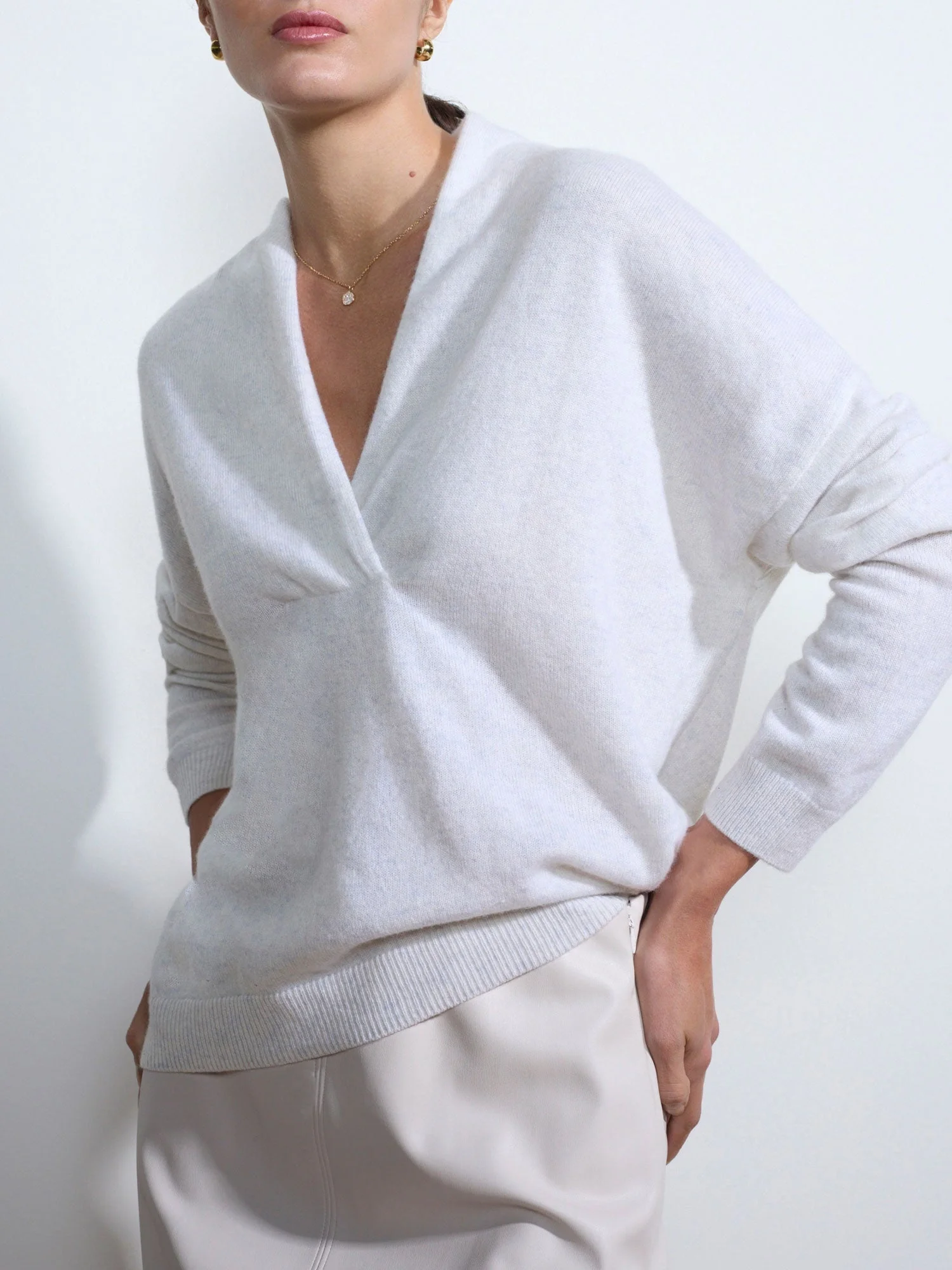 - Relaxed fit - Long sleeves with ribbed cuffs - Drop shoulder - Overlapped v neck - Straight, ribbed hem - Size Small, 24” length - 100% Cashmere - Imported Your new favorite cashmere sweater, in an all-season weight, our Sienna Wrap Neck Pullover is the ultimate in luxe femininity. A sensual, yet casual, wrapped v neckline gently drapes along your decolletage, while the soft drop shoulders envelope you in comfort. An easy everyday piece that takes gently you into the evening. Part of our ‘Kinder To The Environment’ collection, it is made RWS-certified, traceable yarn which means it adheres to stringent animal welfare standards.