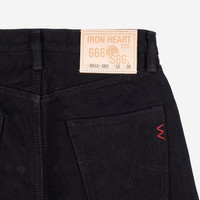 Iron Heart's slim straight cut jean, made out of 21oz "Super Black Fades to Grey" (SBG) selvedge denim. This denim has a black sulphur dyed warp and a black reactive dyed weft. With time the warp will fade but the weft won't. It is heavy, tough, yet soft and extremely breathable. Because of the double twisted weft construction, this denim moulds to an individual's body shape like no other denim. - Made in Japan - Slim straight cut - Low/medium rise - 21oz sulphur rope dyed black warp, reactive dyed black weft Japanese selvedge denim - Woven with a double twisted weft yarn - Lined rear pockets - Button fly and hidden rivets - Belt loops sewn into waistband - Poly/cotton constructional stitching - Selvedge side seams - Sanforized and one washed - little to no shrinkage to be expected - The waist will stretch out approximately one inch with wear - Other dimensions will stretch proportionately to the waist