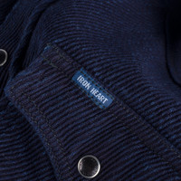 An Iron Heart original, made in Japan from Kersey fabric (a fabric originating from the English medieval times). A characteristic of the shirt is its thickness, soft and comfortable feel, as well as the twill texture and how it reacts with indigo leading to unique fading over time. - Made in Japan - Iron Heart original indigo Kersey fabric - 100% cotton - Fabric weight approx 14oz - Single, double and triple needle stitched throughout - Felled seams, double chain stitched with brown bobbin thread - Black Iron Heart logo'd Permex snaps with button at collar - One-washed, shrinkage not expected