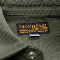 Iron Heart's classic western cut shirt in a 13oz sulphur-dyed olive drab green military grade heavy cotton serge, with black snaps, and made with our usual fantastic attention to detail. Being sulphur-dyed, this fabric will fade over time. - Made in Japan - 100% cotton - 13oz serge fabric - Single, double and triple needle stitched throughout - Felled seams, double chain stitched with brown bobbin thread - Black Iron Heart logo’d Permex snaps - One-washed, shrinkage not expected