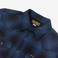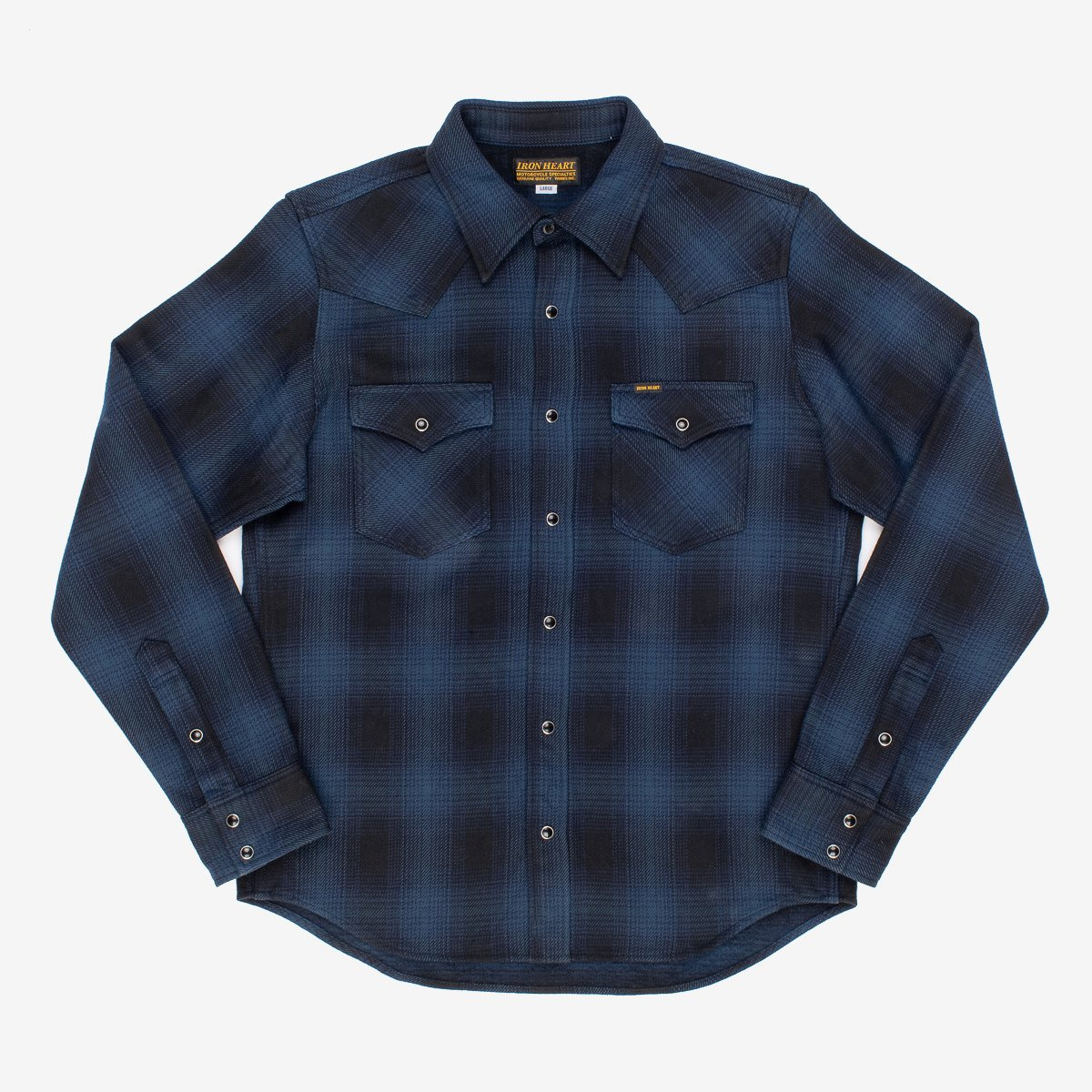 Iron Heart is very proud of their ultra heavy flannel (UHF) shirts. This western shirt is in an exclusive Iron Heart designed navy blue/black ombre check 12oz fabric, woven from Aspero cotton from the foothills of the Andes mountains, double brushed on the inside and single brushed on the outside, resulting in a very soft yet heavy, thick, warm and windproof flannel. - Made in Japan - Western shirt - 12oz Aspero cotton - UHF (Ultra Heavy Flannel) - Iron Heart original 12oz ultra heavyweight ombre check cotton flannel in navy/black - Single brushed on face and double brushed on reverse - Black Iron Heart logo’d Permex snaps - Button at the collar - Two external snap fastened chest pockets - Single, double and triple needle stitch construction - Red bobbin thread - One-washed - potential to shrink half a size with continual or very hot washing/tumble drying