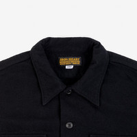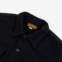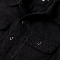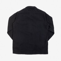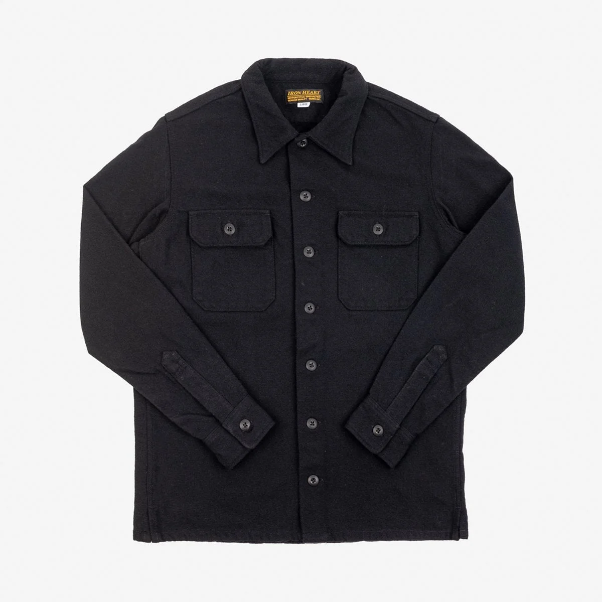 Iron Heart's original mechanic work shirt, constructed from a 100% nylon fabric that is recycled from old fishing nets. The yarns in this fabric are acid dyed and therefore will be more reluctant to give up their colour. This fabric is custom made proprietarily for Iron Heart (like all their fabrics) in an environmentally sustainable fashion, by recycling old fishing nets to create fabric, both reducing waste while crafting a truly interesting fabric. The serge weave gives this a substantial, textured hand, while remaining soft and breathable due to the fabric and the loose weave. With the addition of the simple pockets and military style buttons, this becomes a classic mechanic shirt with a repro lean that allows this to fill the role of the ever classic Vietnam-era sateen CPO when paired with military fabrics, but remains more of a classic garage shirt with some more casual pieces. - Made in Japan - Mechanic shirt - 10oz Japanese serge weave - 100% recycled nylon - Black acid dyed warp and weft - no colour loss to be expected - Black tonal stitching - Black military style buttons - Classic flap patch pockets with button fastenings - Single and double needle stitch construction - Straight back yoke - Felled internal seams - Cotton twill-lined placket - Straight hem with split side gussets - Black bobbin thread - One-washed - no shrinkage expected