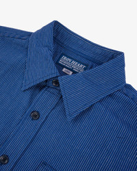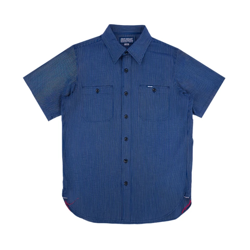 Iron Heart's short-sleeved work shirt, made from 5oz selvedge pinstripe Oxford cloth. Similar in appearance to classic American workwear fabrics such as Wabash or hickory stripe, this plain weave cloth features an intricate pinstripe pattern, creating a lightweight, highly breathable summer shirt that can be dressed up or down. Shuttle loom woven with rope-dyed warp yarns, expect the colour to fade and mellow with vintage character. - 100% cotton - 5oz Japanese selvedge pinstripe plain weave oxford cloth - Indigo rope dyed yarns will fade over time - Short sleeved work shirt - Regular fit - Straight back yoke - Two chest pockets with pen pocket - Tonal button closures - Side gussets with chainstitch runoff - Single, double, and triple needle chainstitch construction - Bar tacked pocket and gusset reinforcements - Felled internal seams - Poly/cotton stitching for longevity - Made in Japan Size up from your usual size