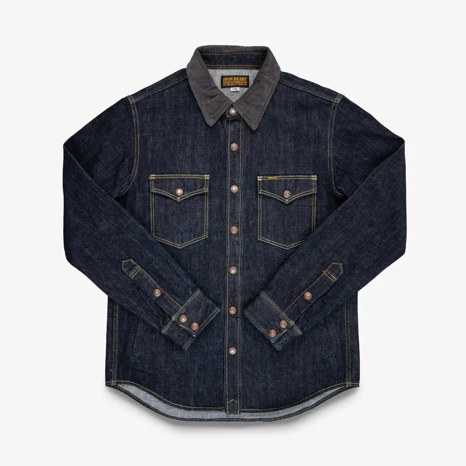 - Made in Japan - Yokeless western-style CPO shirt - 16oz Japanese selvedge denim - 100% cotton - Indigo dyed warp and blue/grey weft - will fade with wear and washing - Contrast stitching - 13 wale corduroy collar lining - 100% cotton - Oversized Iron Heart branded copper snaps (which can be upgraded with a choice of alternative ‘heavy-duty’ snaps) - Western-style flap patch pockets with snap fastenings - Hand warmer pockets with navy twill pocket bags - Single and double needle stitch construction - Yokeless front and straight rear yoke - Felled internal seams - Selvedge placket ID - One-washed - no shrinkage expected