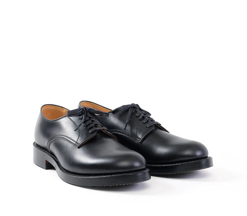 John Lofgren's 140 last runs large, we recommend sizing down one full size from your standard Brannock measurement. Consider a half size if you have a very wide foot or high instep. In 1941 the khaki uniform was approved for officers in all branches of the US Navy, and the plain low quarter shoe became the standard for wear with the uniform. Regulation US Navy shoes were made in black or brown chrome calfskin, had a Goodyear welt leather sole, a plain toe, and followed a classic blucher pattern.John Lofgren Bootmaker USN Low Quarter Shoes are made robust and follow the same construction guidelines as the original WWII era shoes that were issued to USN and USMC officers. They are masterpieces crafted by people passionate about footwear and designed to maintain tradition while meeting modern day needs. - Lot No. LK-029 - French calfskin (that's finished in Japan) uppers and Japanese leather lined - Goodyear welted construction using Japan made flat welts - Double and triple stitched sewing - 1-1/8" stacked heel US made Quabaug heels and Italian made Vibram half soles - Japanese made steel shanks - Embossed padded leather heel pad - E width - Built on the John Lofgren 140 last - Includes Japanese made John Lofgren Bootmaker box and dust bags