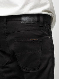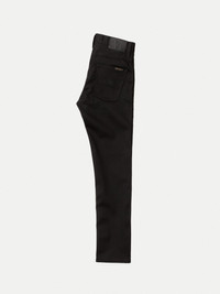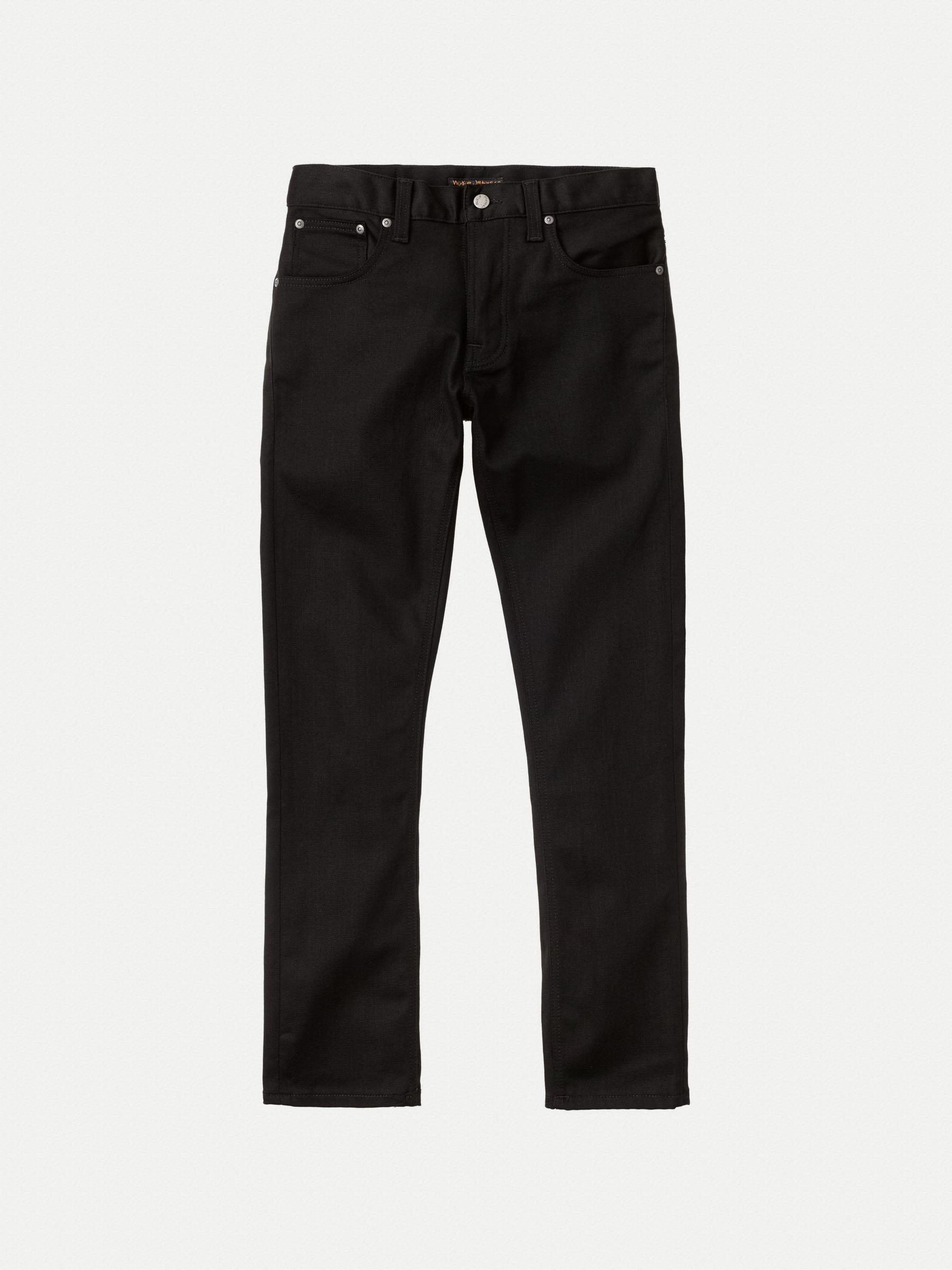 Jeans with a straight slim fit made in Nudie's organic comfort stretch Everblack denim. Pitch black jeans made in dry comfort stretch denim that stays black. The Everblack fabric is made to maintain its color for as long as possible, withstanding 40, or more washes without any significant loss of color. If you are looking for a pair of pitch-black jeans that do not fade this is the way to go. Normally, when denim is dyed part of the dye will absorb in the cotton fibers while the rest remains bound only to the surface of the yarns. This is what gives denim its aging property that in many cases is sought after. However, when it comes to black jeans this is not always the case which is why we developed the Everblack denim. The technical difference between Everblack and regular black denim is that it utilizes a method and type of dyestuff that allows improved absorption as well as a stronger fixation. This results in denim with a significantly greater colorfastness, which does not fade with wearing and washing. - Organic cotton - 12 oz comfort stretch denim - Black threads on all seams - Antique silver trims - Button fly - Jacron patch - Slim fit - Mid waist - Straight leg - Slim leg opening - 99% Cotton / 1% Elastane - Made in Tunisia