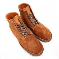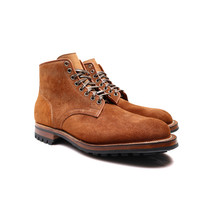All our Viberg Service Boots are on a single E width, we suggest sizing down one full size from your standard sneaker size or brannock measurement, or one half size down if you have wide feet. Viberg's Service Boot is directly based on their original model, first produced in 1931. A similar pattern was also used by multiple nations as a standard issue military boot during WWII, however Viberg's quintessential Service Boot is modeled after the Canadian military's WWII Service Boot pattern. This makeup features Horween's Chamois Roughout leather, which has long since established itself as a favourite amongst heritage footwear fans. Chamois is a heavily oiled nubuck leather that offers extreme versatility, particularly on the roughout side. The inherent oiled finish of Chamois further enhances an already very durable roughout leather into something outstanding, while bringing with it a super low maintenance nature that allows you to easily break these in and wear them without concern. Chamois and Viberg are a time-tested pairing, always producing incredible makeups. - Horween Aged Bark Chamois R/O - 1035 last - Veg-tan lined interior - 8 AA onxidized copper eyelets - Structured toe - Plain toe - Leather toe puff - Smooth Aged Bark tongue - Antique Brown leather midsole - Black Commando outsole - Resoleable Stitchdown construction - Small batch, limited run production made at Viberg's factory in Victoria, BC